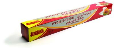 Prestige Aluminum Film is of premium quality and has greater strength than standard rolls. Its thickness is perfect for endurance. It conveniently comes in a continuous roll within a cutter box with standard cutting edges in order to be safely used in cooking, serving and freezing food. This practical product comes in different sizes: 25ft; 37.5ft; 75ft; 200ft; 300mm*600g; 30cm*750g or 30cm*1500g.
